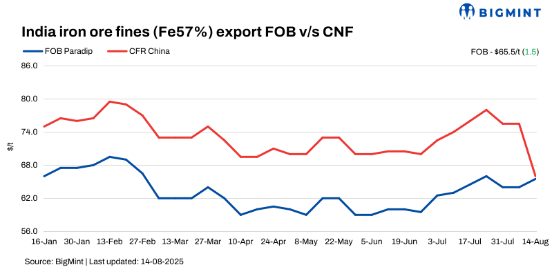 BigMint’s bi-weekly Indian low-grade iron ore fines (Fe 57%) export index hiked by $1.5/tonne (t) w-o-w to $65.5/t FOB east coast on 14 August. A 60,000 t fines export (Fe57%) was recorded at $77/t CFR China in this publishing window.