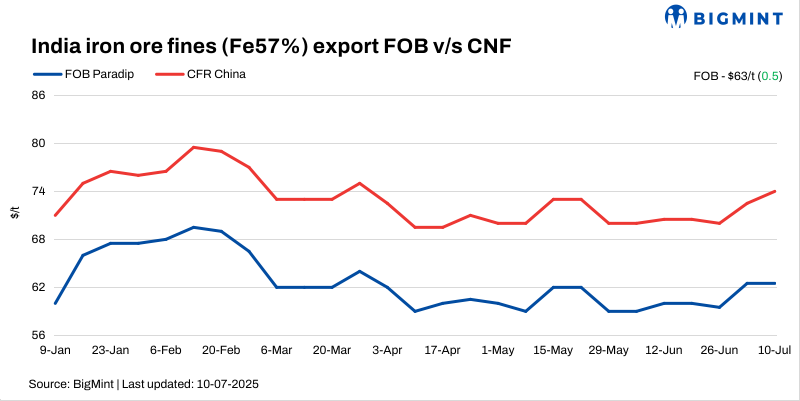 BigMint’s bi-weekly Indian low-grade iron ore fines (Fe 57%) export index inched up by $0.5/t w-o-w to $63/t FOB east coast on 10 July. Around 350,000 t Fe57% fines were sold at $72-74/t CFR China in the last week. Furthermore, around 200,000 t of lower-grade (Fe54-55%) fines deals were recorded.