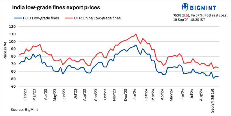 BigMint’s weekly Indian low-grade iron ore fines (Fe 57%) export index inched down by $0.5/tonne (t) w-o-w to $53/t FOB east coast on 19 September 2024. The discount level remained similar to last week’s at 20-23% on the global fines index. No other deals were reported from India in the seaborne market as major exporters chose to be cautious instead of selling at current prices, fearing potential losses in the current trading window.