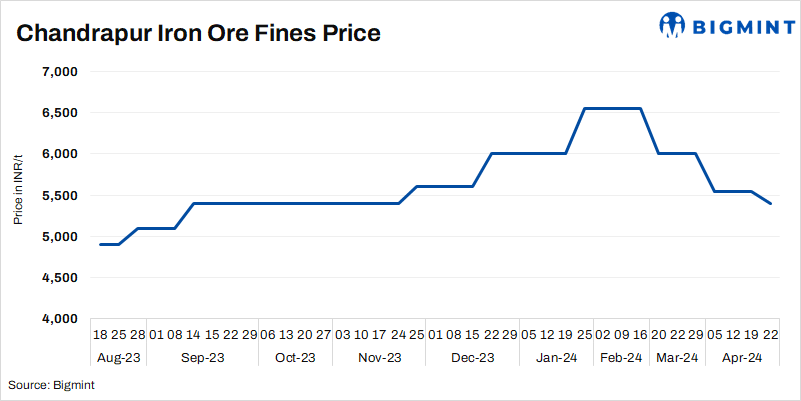 - Current offers are at INR 5,400/t as against INR 5,550/t FOR Balharshah assessed on 19 Apr’24. However, lumps offers increased by INR 300/t to INR 9,100/t FOR Chandrapur.