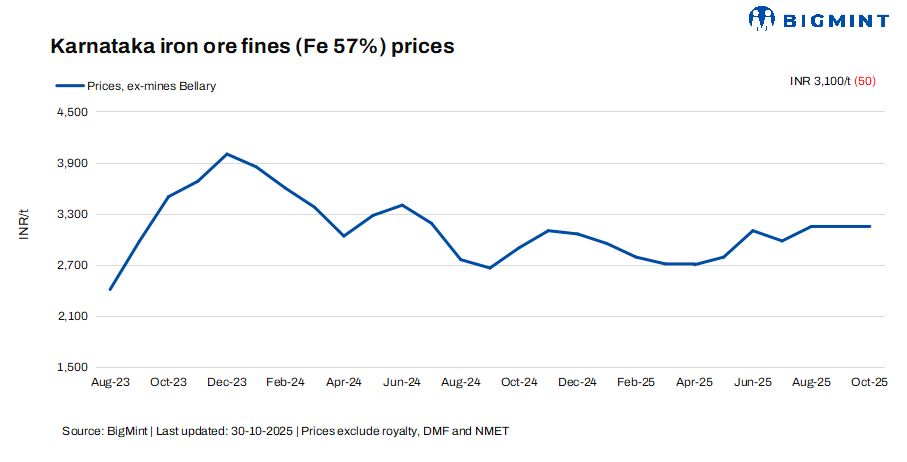 • NMDC’s auction receives decent response: NMDC conducted iron ore auctions from its Kumaraswamy and Donimalai mines in Karnataka this week. At the Kumaraswamy mines auction held on 29 October, NMDC offered 192,000 t, which was fully booked, with lumps fetching premiums of INR 230-680/t and fines up to INR 680/t. Around 80,000 t of lumps (10-40 mm, Fe 61.12-61.77%) was sold at INR 4,449-4,740/t against a base price of INR 4,060-4,219/t, while 112,000 t of fines (Fe 57.84-61.02%) was booked at INR 2,799-4,110/t compared with a base range of INR 2,789-3,188/t. In the Donimalai auction, 24,000 t of lumps (10-40 mm, Fe 54-55%) were booked at INR 2,827-2,907/t and 40,000 t of fines (Fe 56%) at INR 2,549/t. All prices are inclusive of royalty, DMF, and NMET charges.