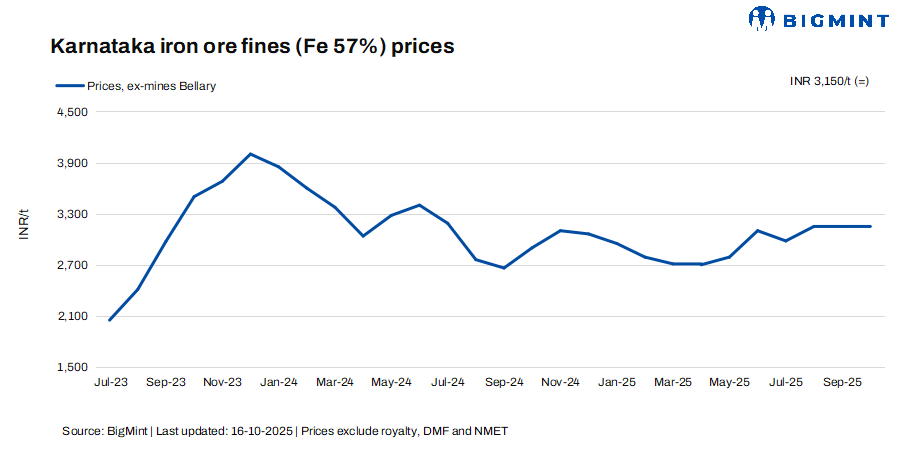 - NMDC’s auction receives good response: NMDC’s recent iron ore auctions from its Donimalai and Kumaraswamy mines received a fairly positive response. On 14 October, the Donimalai mine auction saw full bookings, with 32,000-t lumps (10-40 mm, Fe 54%) and 8,000-t fines (Fe 56%) booked at base prices of INR 2,738/t and INR 2,989/t. Similarly, the 15 October auction from the Kumaraswamy mines recorded sales of 70,000-t lumps (10-40 mm, Fe 59.63-60.60%) booked at INR 4,981-5,362/t against base prices of INR 4,381-4,662/t and 80,000-t fines (Fe 58.31-63.34%) booked at INR 3,399-5,630/t. All prices are on an ex-mines basis and include royalty, DMF, and NMET.