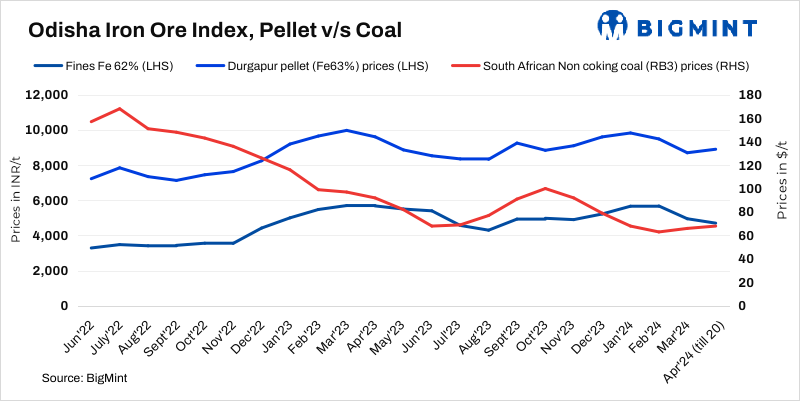 • Pellet offers rise in domestic: Pellet (6-20 mm, Fe 62.5%) prices in Odisha’s Barbil rose by around INR 450/t ($6/t) w-o-w. The current assessment stands at INR 8,350/t ($100/t) loaded to wagon. Pellet (Fe 62.5%, 6-20 mm) prices in Durgapur also increased by INR 550/t ($7/t) w-o-w to INR 9,450/t ($115/t) exw on 19 April. Meanwhile, BigMint’s India pellet (Fe 63%, 3% Al) export index (FOB east coast) increased by $7/tonne (t) w-o-w to $103/t on 17 April, 2024.