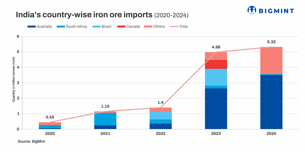 India’s iron ore imports reached 5.32 million tonnes (mnt) in CY’24. Volumes witnessed an increase of around 7% y-o-y against 4.98 mnt in CY’23 driven by factors such as rising domestic demand, supply constraints from key mining regions, and fluctuations in global iron ore prices.