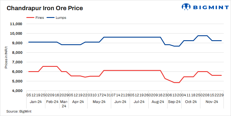 • Iron ore fines (0-10 mm, Fe 63%) offers in Chandrapur, Maharashtra, remained stable w-o-w at INR 5,600/t FOR Balharshah on 29 Nov’24. Meanwhile, lumps (5-18 mm, Fe 63%) offers remained unchanged w-o-w at INR 9,250/t FOR Chandrapur.