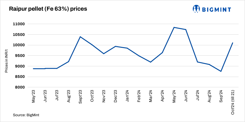 Raipur-based pellet makers recently raised their offers for iron ore Fe 63% (+/_0.5%) by INR 500/t ($6/t) to INR 10,400-10,500/t ($124-125/t) exw, following a corresponding hike by Odisha-based producers. GPIL has opened pellet offers for Fe 63% and Fe 65% grades at INR 11,000/t ($131/t) and INR 12,200/t ($145/t) exw respectively. In the latest iron ore auction from the OMC, bid premiums increased by over INR 1,000/t ($12/t) m-o-m.