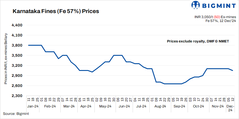 - NMDC Kumaraswamy auction receives decent response: NMDC Kumaraswamy conducted an iron ore auction on 7 December, 2024 in which 48,000 t of lumps (10-40 mm, Fe 62.79%) got booked at INR 5,587/t against the base price of INR 5,477/t and 32,000 t fines (Fe 54.60-62.07%) got booked at base price of INR 2,828-4,400/t . Prices are on ex-mines basis, including royalty, DMF and NMET. Notably, bid prices of lumps were higher by INR 110/t.