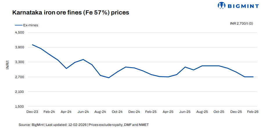 Domestic iron ore prices in Karnataka’s Bellary region continued to hold firm w-o-w as of 12 February, underpinned by steady procurement, active market participation, and constrained availability. Low-grade fines (Fe 57%) remained unchanged, with BigMint’s weekly index assessed at INR 2,700/t ($30/t) ex-mines, excluding taxes. Similarly, Fe 62% fines stayed stable at INR 5,100/t ($56/t) ex-mines, reflecting the market’s strong resistance to any downward correction despite evolving downstream dynamics.