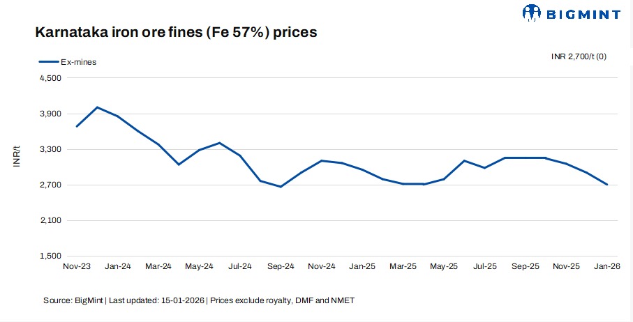 Prices of low-grade iron ore fines (Fe 57%) in Karnataka remained unchanged, with BigMint’s weekly index assessed at INR 2,700/t ($30/t) ex-mines, excluding taxes, as of 15 January, unchanged from the previous assessment on 8 January. Similarly, prices of Fe 62% iron ore held stable at INR 5,100/t ($57/t) ex-mines, inclusive of taxes, recording no w-o-w movement amid unchanged fundamentals and cautious buyer attitude.