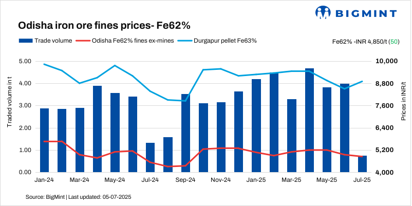 BigMint’s Odisha iron ore fines (Fe 62%) index inched up by INR 50/t ($0.5/t) w-o-w to INR 4,850/tonne (t) ($57/t) ex-mines on 5 July 2025. Though offers for the same coming around INR 4,900-5,000/t ex-mines. Notably, deals for around 750,000 t of iron ore (fines and lumps) were recorded by BigMint in Odisha, concluded by merchant sellers with larger stack of the mid-grad fines material.