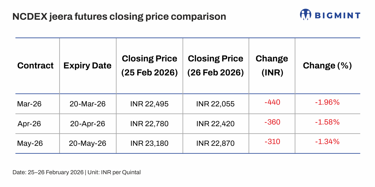 India’s jeera prices softened in late February 2026, as fresh arrivals from the new 2026 crop began entering key mandis, particularly Unjha and Rajkot. NCDEX jeera futures (most active contract) declined by 1.96% w-o-w on 26 February 2026 to INR 22,055 per quintal, reflecting early harvest pressure and cautious buyer participation. Similarly, Unjha spot prices eased by 0.26% on 26 February 2026 to around INR 22,192 per quintal, indicating mild weakness in physical markets.