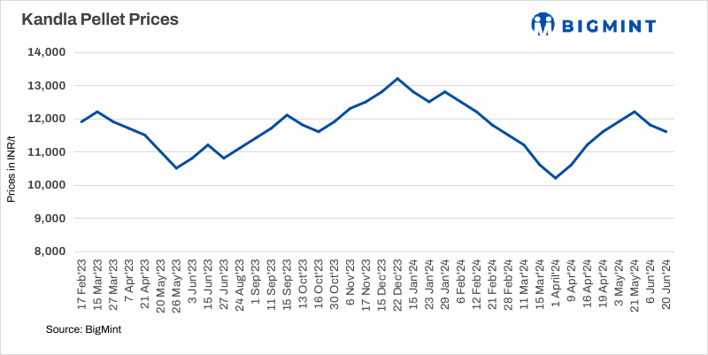 Jindal SAW has decreased pellet (Fe63%) offers by INR 200/t ($2.5/t) to INR 11,600/t ($138/t) DAP Kandla on 20 Jun’24 with around 5,000 t deal at revised offers. The drop in the domestic sponge and steel commodity prices has forced the plant to reduce the offers. Iron ore (Fe62%) fines spot prices remained range-bound w-o-w at $107/t CFR China on 19 Jun.
