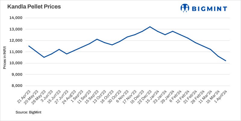 Jindal SAW has reduced pellet (Fe63%) offers by INR 400/t ($5/t) to INR 10,200/t ($127/t) DAP Kandla today. However, no deals were witnessed at revised prices from buyers. The pellet offers fell as iron ore (Fe 62%) fines spot prices declined by $8/t w-o-w to $103/t CFR China on 28 Mar.