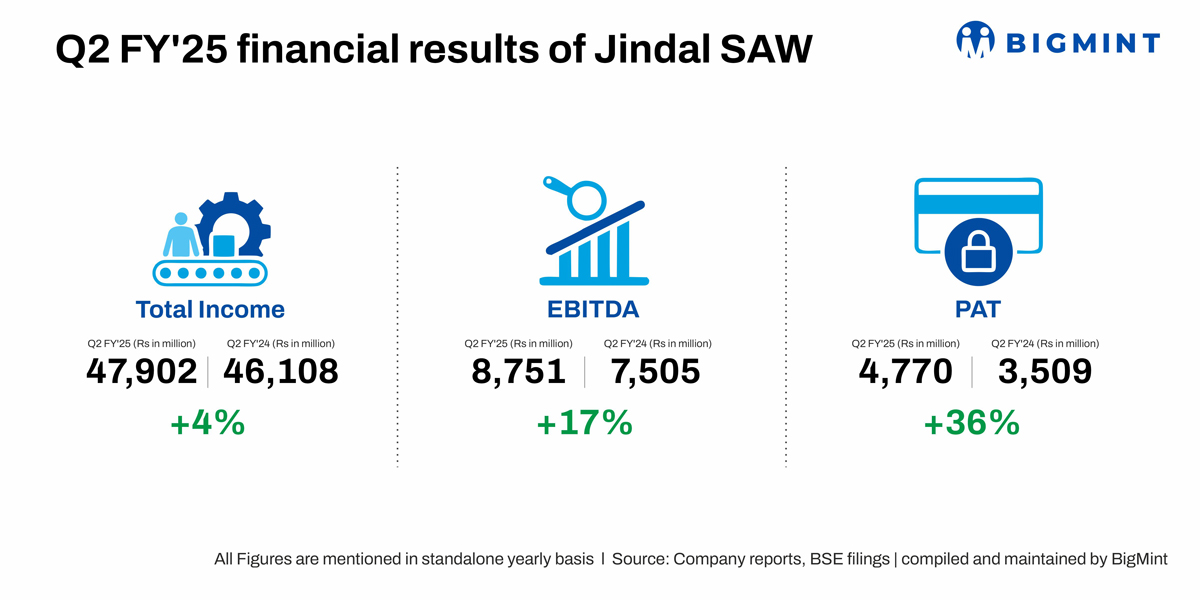Jindal SAW’s total income (standalone) for second quarter of financial year 2025 (Q2FY’25) stood at INR 47,902 million, higher by 4% y-o-y compared to INR 46,108 million in Q2FY’24, the company reported in its investors’ call held on 21 October, 2024.