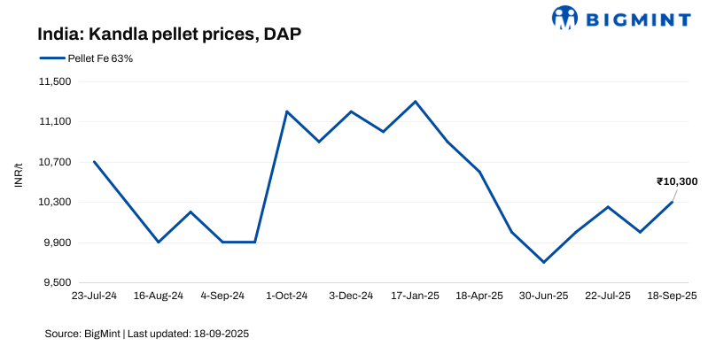 Jindal SAW increased its pellet (Fe 63%) offers by INR 300/t ($3/t) to INR 10,300/t ($117/t) DAP Kandla on 18 Sep’25. Recent pellet export deals from the west coast and a hike in iron ore prices led to the rise in pellet offers. However, no deals were concluded at fresh offers amid cautious buying by steelmakers. Meanwhile, Chinese spot iron ore fines Fe62% rose by $3.5/t to $105.3/t CFR China in Sep.