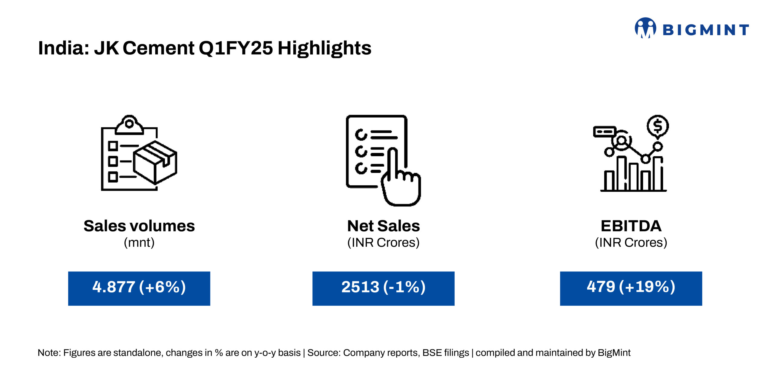 In the white cement segment, sales edged higher by 2% y-o-y to 0.513 mnt in Q1FY’25 from 0.503 mnt in Q1FY’24. While q-o-q basis, sales fell by 4% against 0.534 mnt in Q4FY’24.