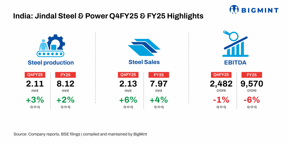 Steel sales up y-o-y: JSP reported sales volumes of 7.97 mnt in FY’25, up 4% as compared with 7.67 mnt in the same period of the previous year. In Q4FY’25, sales volumes witnessed an increase of 6% y-o-y to 2.13 mnt against 2.01 mnt in Q4 of last year.
