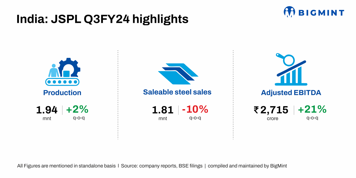 The production of Jindal Steel & Power Limited (JSPL) edged up by 2%, while sales decreased by 10% q-o-q in Q3FY24, BigMint learnt from the company’s investors call held on 31 January 2024.