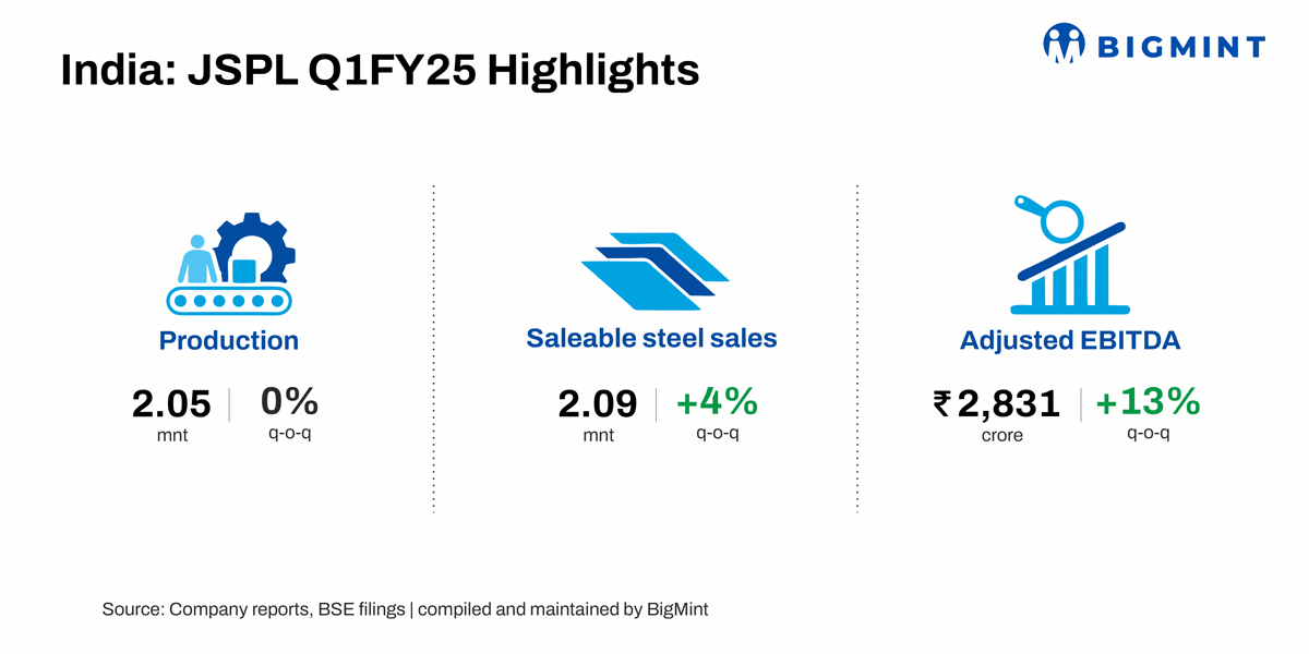 Steel production by Jindal Steel & Power (JSP) remained stable in Q1FY’25, while sales increased by 4% q-o-q. Capital expenditures for the quarter amounted to INR 2,796 crore. The 6 million tonne per annum (mtpa) expansion project’s on-site progress is proceeding as planned. The core facility, comprising the blast furnace and pure CRM, is anticipated to be operational by Q4FY’25. Completion of the remaining auxiliary infrastructure is projected within the subsequent 9-12 months.