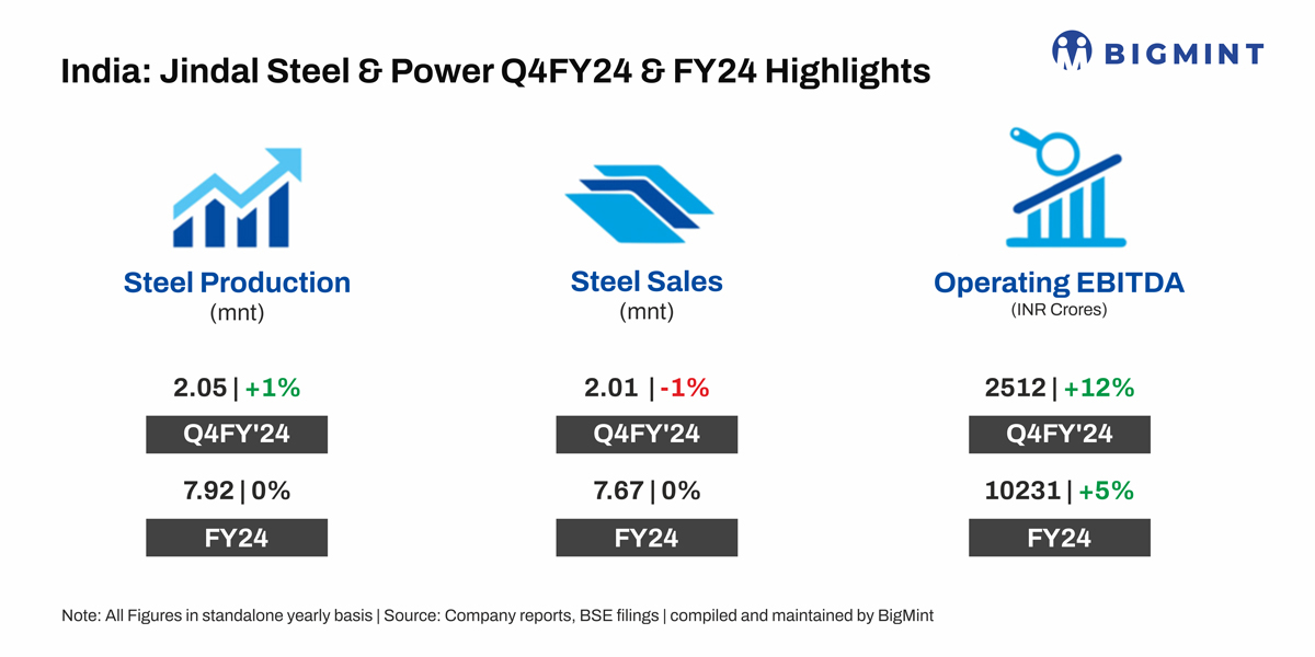 Steel production flat y-o-y: The company’s steel production remained largely flat y-o-y at 7.92 mnt in FY24 against 7.89 mnt in the previous year. In Q4FY24, production volumes edged upwards by 1% to 2.05 mnt from 2.02 mnt in Q4FY23.