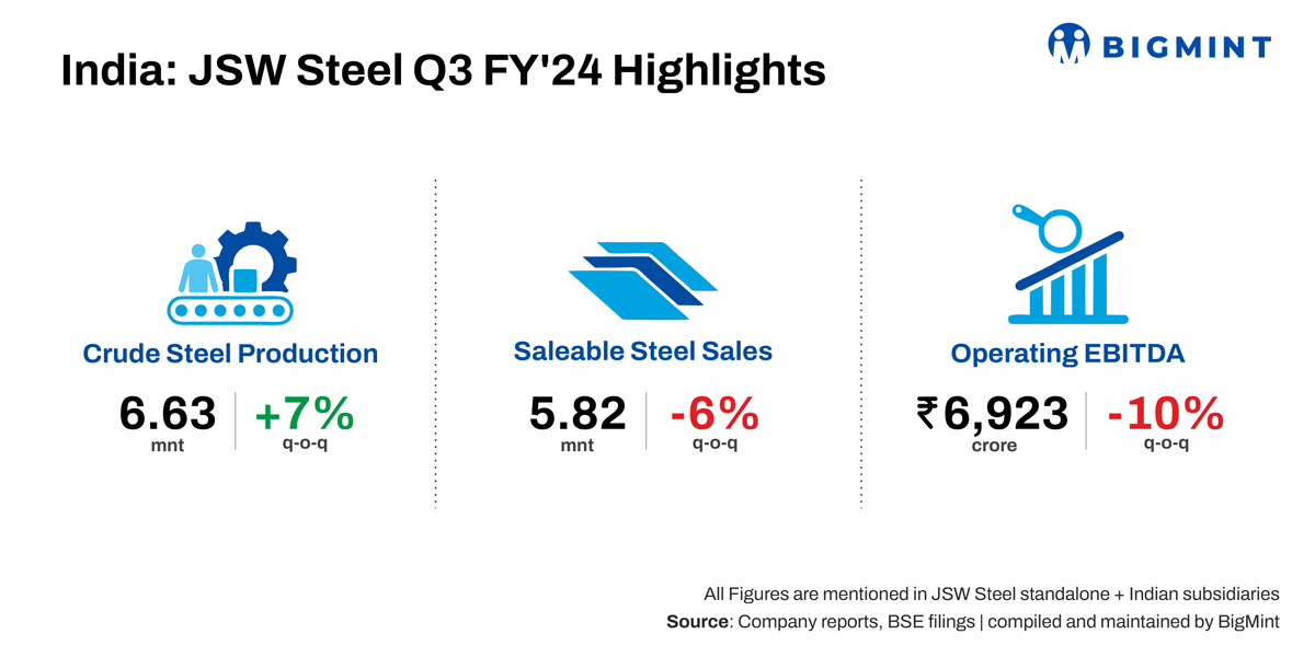 Indian private steel major, JSW Steel’s, crude steel production increased, while the sales volumes declined q-o-q in Q3FY24, BigMint learnt from company’s investors call held on 25 January 2024.