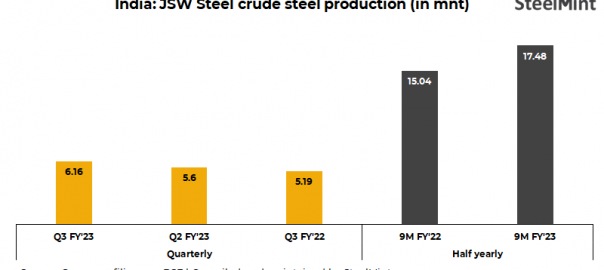 JSW Steel’s crude steel production rose by 10% q-o-q to 6.16 mnt in Q3FY’23 as compared with 5.60 mnt a quarter ago. The company operated with higher capacity utilisation of 91% in Q3 versus 84% in Q2FY’23. Notably, the same registered 19% growth y-o-y against 5.19 mnt in Q3FY’22. The company’s crude steel output was higher by 16% y-o-y at 17.48 mnt during Apr-Dec’22 from 15.04 mnt in the same period last year.