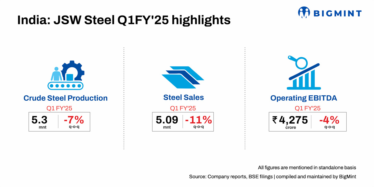 Indian steel major, JSW Steel has posted q-o-q decline in crude steel production and sales in first quarter of financial year 2025 (Q1FY’25). The performance was impacted by lower volumes due to maintenance shutdown at Dolvi and Bhushan Power & Steel Limited (BPSL) and inventory losses. The company’s production guidance for FY’25 remains on track at 28.4 mnt, sales guidance at 27 mnt, BigMint learnt from company’s investors call held on 19 July. The steel major is committed to achieve net zero emission by 2050.