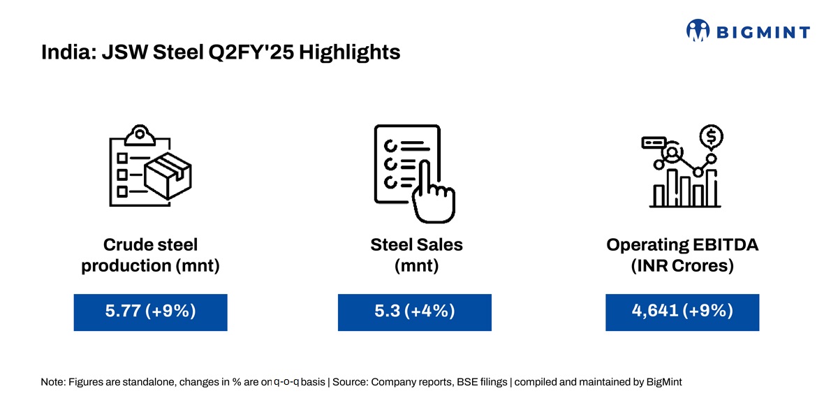 The standalone entity of Indian steel major JSW Steel reported a q-o-q rise of 9% and 4% in crude steel production and sales, respectively, in the second quarter of financial year 2024-25 (Q2FY’25).
