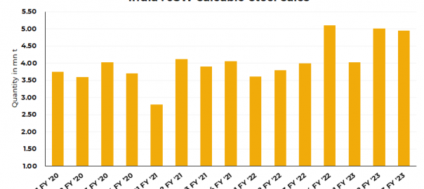 JSW Steel recorded steel sales at 4.95 mnt in Q3FY’23, almost stable q-o-q as compared to 5.01 mnt in Q2FY’23. Sales of flat steel stood at 3.7 mnt and long steel at 1.14 mnt, while semis sales stood at 0.10 mnt in the quarter under review. However, sales registered an increase of 24% y-o-y as against 4 mnt in Q3FY’22.