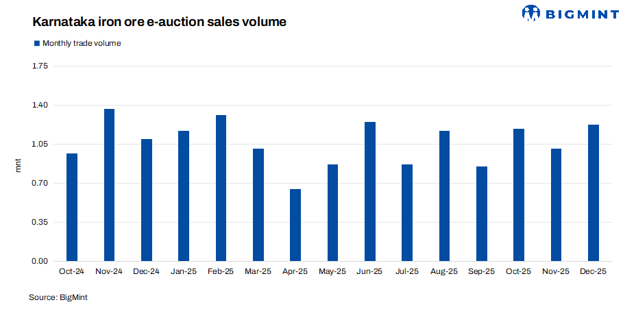 Iron ore e-auction sales in Karnataka staged a strong recovery in December 2025, surging 23% m-o-m to 1.24 million tonnes (mnt) from 1.01 mnt in November, as per data maintained by BigMint. The sharp rebound was largely driven by improved participation from secondary steelmakers and sponge iron producers, who returned to auctions amid marginally better finished steel realizations.
