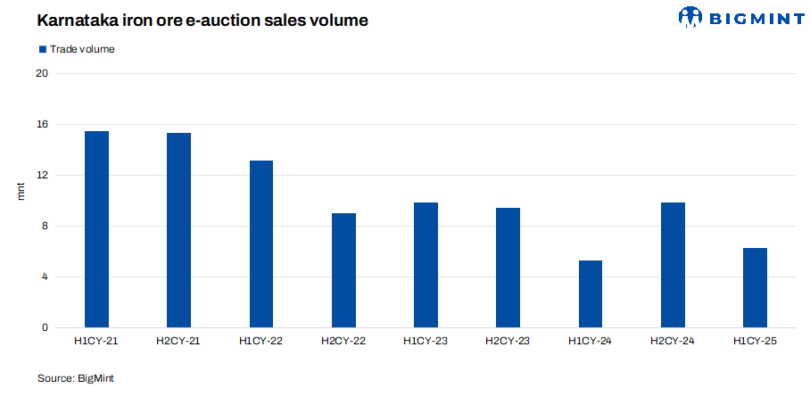 Karnataka’s iron ore e-auction sales witnessed an increase in the first half (January-June, 2025) of the calender year 2025 (H1CY’25). Sales volumes stood at 6.26 million tonnes (mnt), up by 19% y-o-y from 5.31 mnt in H1CY’24, as per BigMint’s data. H1CY’25 volume comprised 3.3 mnt of fines and 2.96 mnt of lumps.