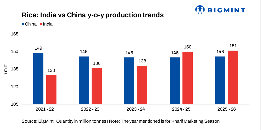 For much of the past decade, China maintained a narrow lead in rice output. In 2021–22, China produced 149 million tonnes against India’s 130 million tonnes. Since then, China’s production has edged lower to the mid-140 million-tonne range, while India’s output climbed consistently, reaching 151–152 million tonnes by 2025–26.