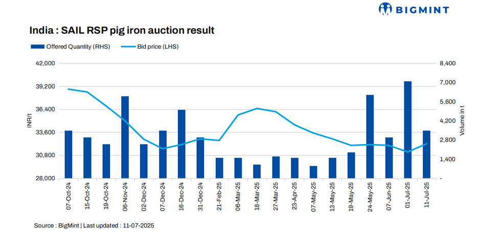 SAIL’s Rourkela Steel Plant (RSP) conducted an auction for 3,500 t of steel-grade pig iron on 11 Jul’25, in which the entire quantity was booked at an average price of INR 32,200/t exw. This shows an increase of INR 1,000/t compared to the previous auction on 1 Jul in which 7,100 t were sold at INR 31,200/t exw.