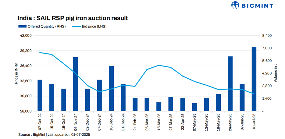 SAIL’s Rourkela Steel Plant (RSP) conducted an auction for 7,100 t of steel-grade pig iron on 1 Jul’25, in which the entire quantity was booked at an average price of INR 31,200/t exw. This shows a decrease of INR 800/t compared to the previous auction on 7 Jun’25, in which 3,000 t were sold at INR 32,000/t exw.
