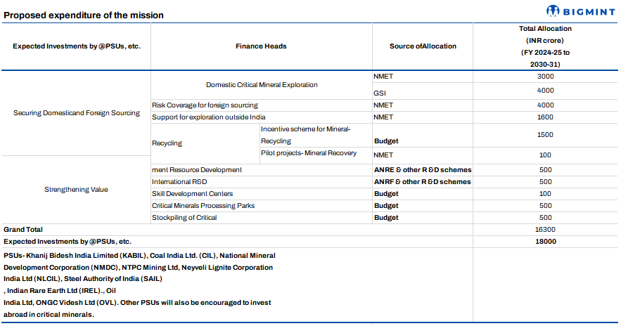 Acquisition of critical mineral assets abroad: The mission will support a mapping and detailed exploration of critical mineral assets in resource-rich countries through the GSI, PSUs, or other Indian entities. The NMET is expected to spend INR 1,600 crore to support critical mineral exploration activities outside India.