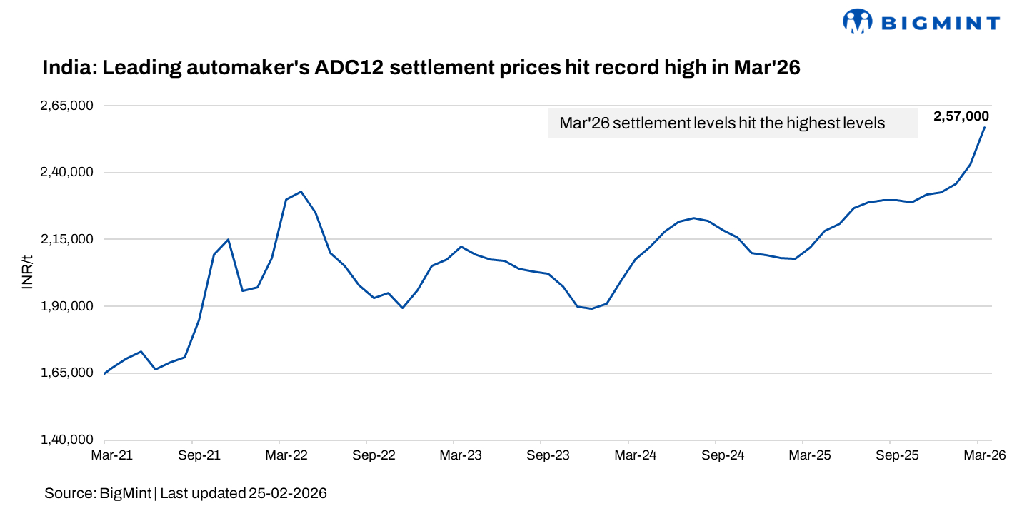 India: Leading automaker raises ADC12 Mar’26 settlement by INR 13,900/t
