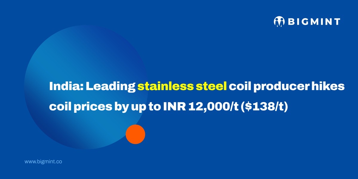 India: Leading stainless steel manufacturer increases coil prices by up to INR 12,000/t ($138/t)