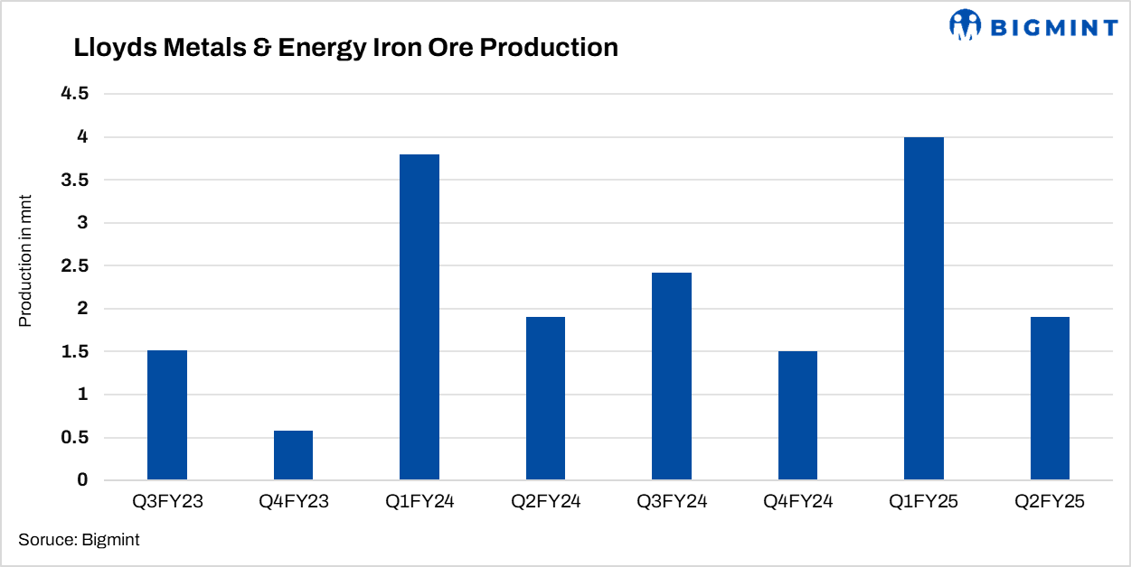 - Lloyds Metals and Energy has reported a y-o-y rise of 4% in its iron ore output which stood at 5.9 mnt in H1FY’25 against 5.7 mnt in H1FY’24.