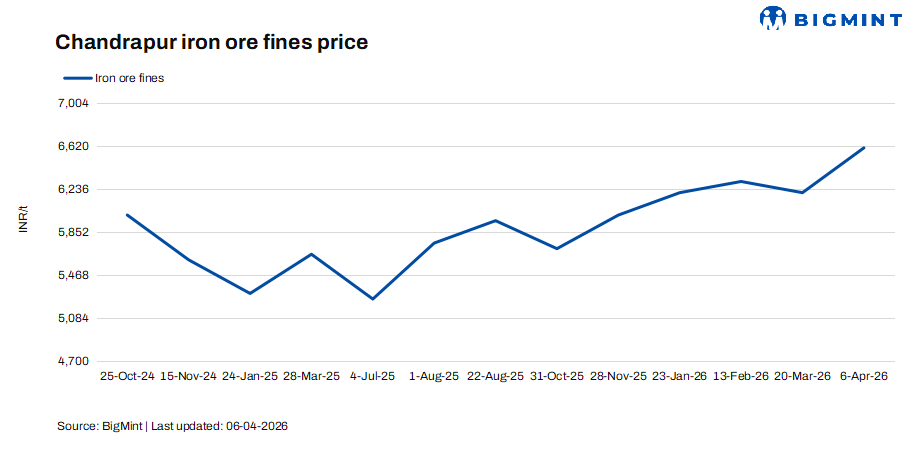 Lloyds Metals and Energy has raised its prices for iron ore fines, lumps, and pellets in Chandrapur by INR 400-500/t. Iron ore fines (Fe 63%) increased by INR 400/tonne (t) ($4/t) w-o-w to INR 6,600/t ($71/t) FOR Balharshah as of 5 Apr’26. Lump offers rose by around INR 500/t ($5/t) to INR 9,885/t ($106/t) FOR Chandrapur, while pellet prices were also hiked by INR 500/t ($5/t) to INR 11,835/t ($127/t) exw. The revision reflects improving domestic fundamentals, supported by firm steel prices and stronger sponge iron demand, along with the recent hike in NMDC’s iron ore prices for April delivery from Chhattisgarh.