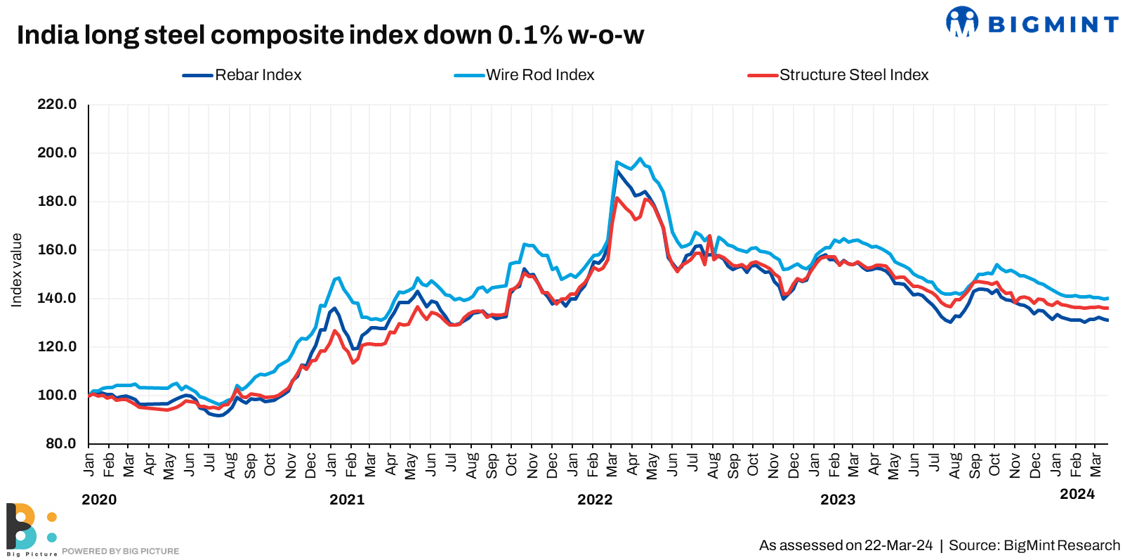 Longs price stayed supported essentially because of the recent production cuts from the larger mills which encouraged them to raise list prices by around INR 500/t ($6/t) earlier in the month. It may be recalled that rebar inventories had fallen to a three-month low of around 500,000 t in early March in a knee-jerk reaction to the cut in output by 80,000-100,000 t in February. Market sources hinted that rebar production from tier-1 mills may now fall by another 70,000-80,000 t in March-end. Supported by the above factors, trade-level blast furnace prices rose by INR 400/t ($5/t) to INR 52,400/t ($626/t).