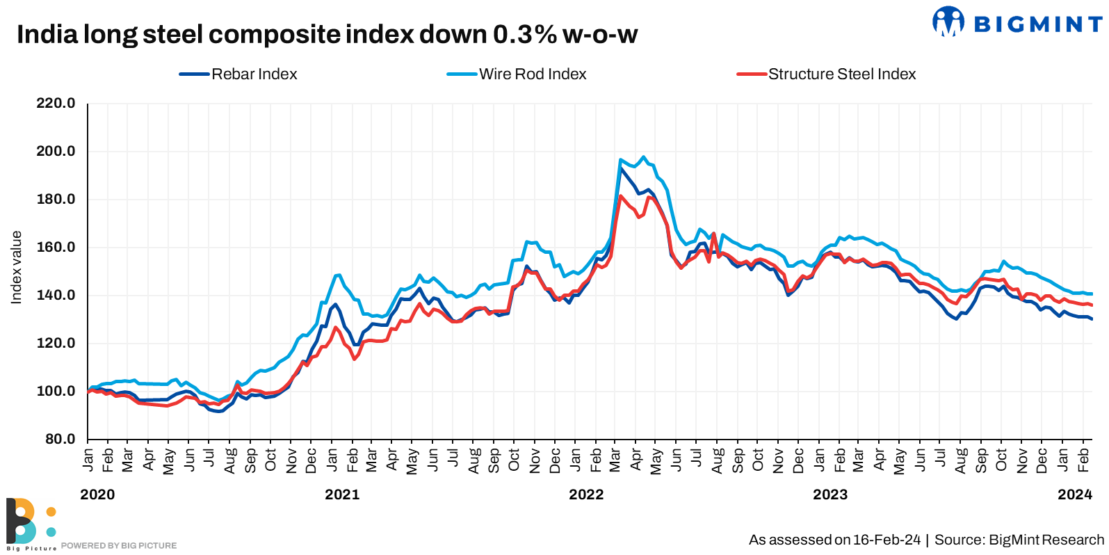 The slide in the BF segment was partly a knee-jerk reaction to the dullness prevailing in the induction furnace (IF) rebar space which commands 65-70% of the market. Prices here remained flat w-o-w at INR 48,100/t ($579/t). Here too, lacklustre buying amid rising inventories did not allow mills any space to raise offers. With the BF-route prices sliding further, the average spread with induction furnace (IF) material has normalized to INR 3,500-4,000/t (42-48/t). However, the worrisome aspect here is that the spread normalization has happened at lower price points.
