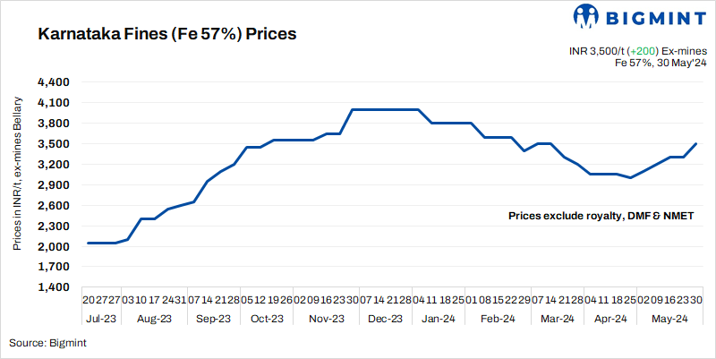 Domestic low-grade iron ore fines (Fe 57%) prices witnessed an increase this week in Karnataka’s Bellary. BigMint’s weekly index for low-grade iron ore fines (Fe 57%) stood at INR 3,500/t ($42/t) ex-mines Bellary (excluding taxes), a w-o-w rise of INR 200/t ($2/t).