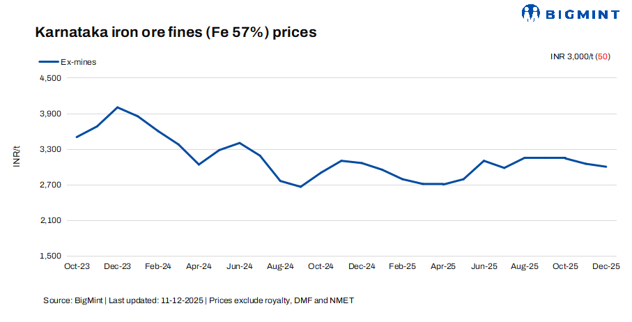 Iron ore prices in Karnataka are likely to remain under pressure over the course of December due to weak demand from downstream sectors and subdued sponge iron activity. High-grade material will continue to see tight supply supporting its prices, while logistics challenges and muted buying interest could further weigh on prices.