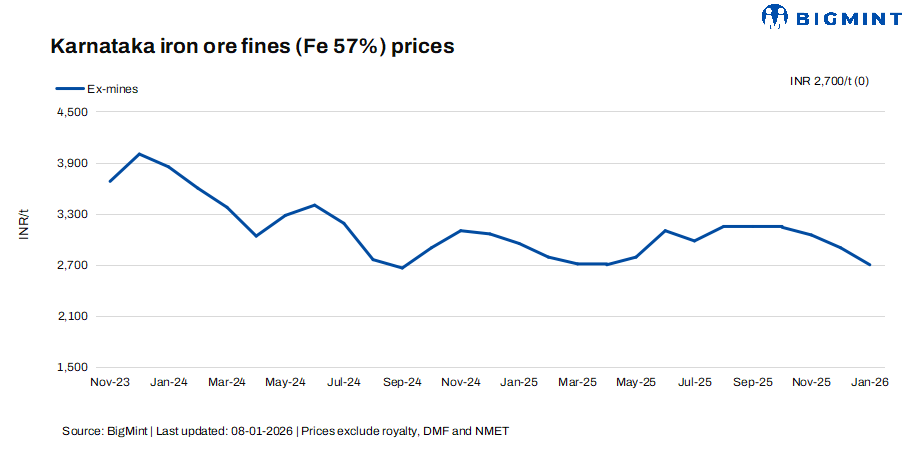 Domestic iron ore prices in Karnataka’s Bellary region continued to reflect a phase of prolonged stability, underscoring the prevailing caution in the market. Prices of low-grade iron ore fines (Fe 57%) remained unchanged, with BigMint’s weekly index assessed at INR 2,700/t ($30/t) ex-mines, excluding taxes, as of 8 January, the same level as recorded on 1 January. In a similar trend, prices of Fe 62% iron ore also held steady at INR 5,100/t ($57/t) ex-mines, inclusive of taxes, registering no w-o-w movement amid largely unchanged market dynamics and muted trading activity.
