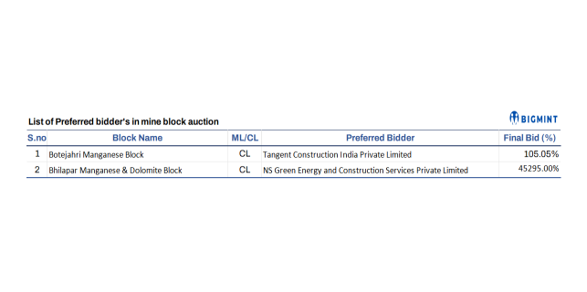 The Madhya Pradesh Mineral Resources Department has announced the preferred bidders for Phase XV mineral block auctions: