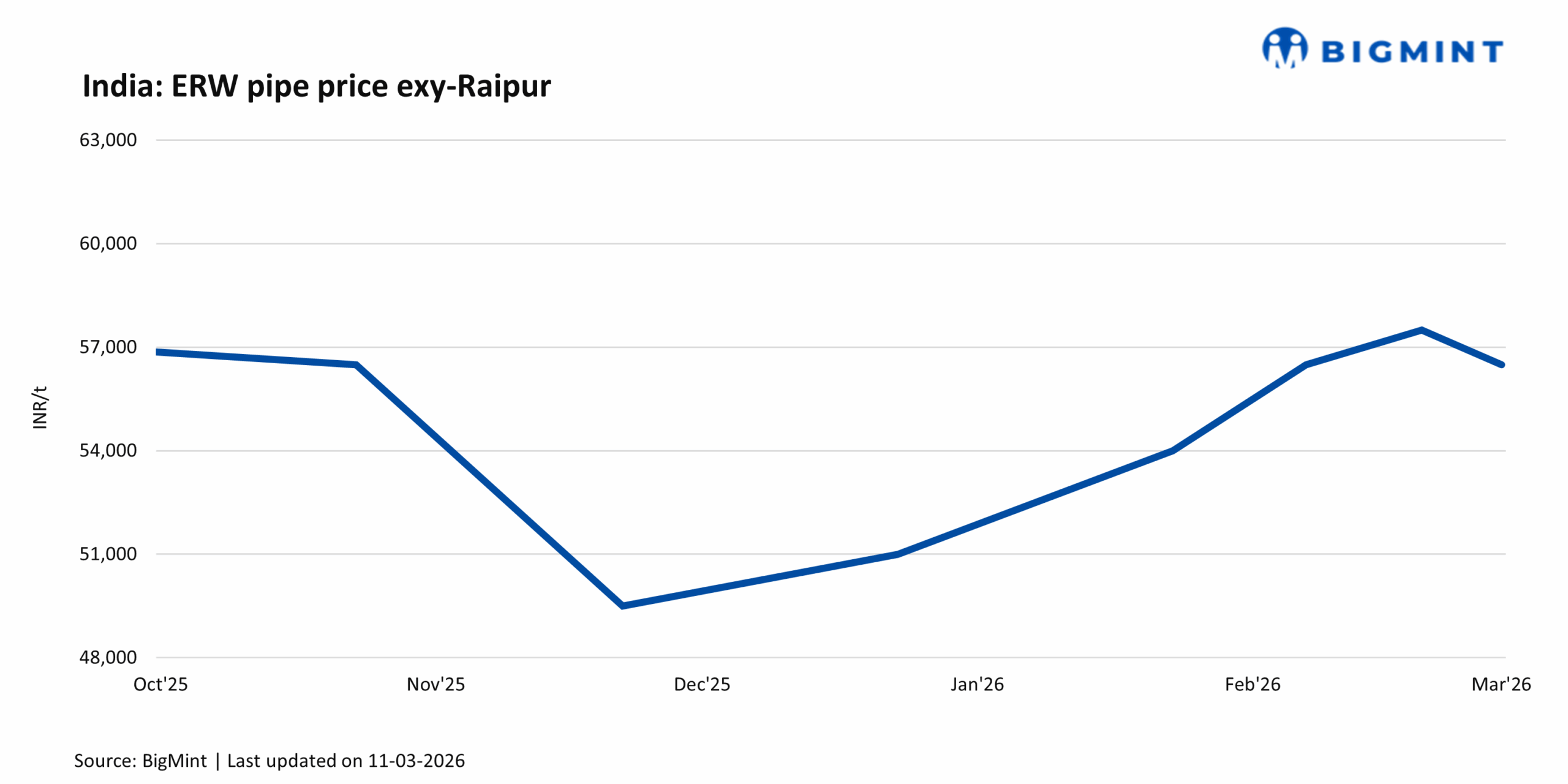 Distributor-level monthly average prices of ERW pipes in Raipur declined by INR 850/t ($9/t) m-o-m to INR 57,300/t ($624/t) in March compared with INR 58,150/t ($633/t) in February 2026.