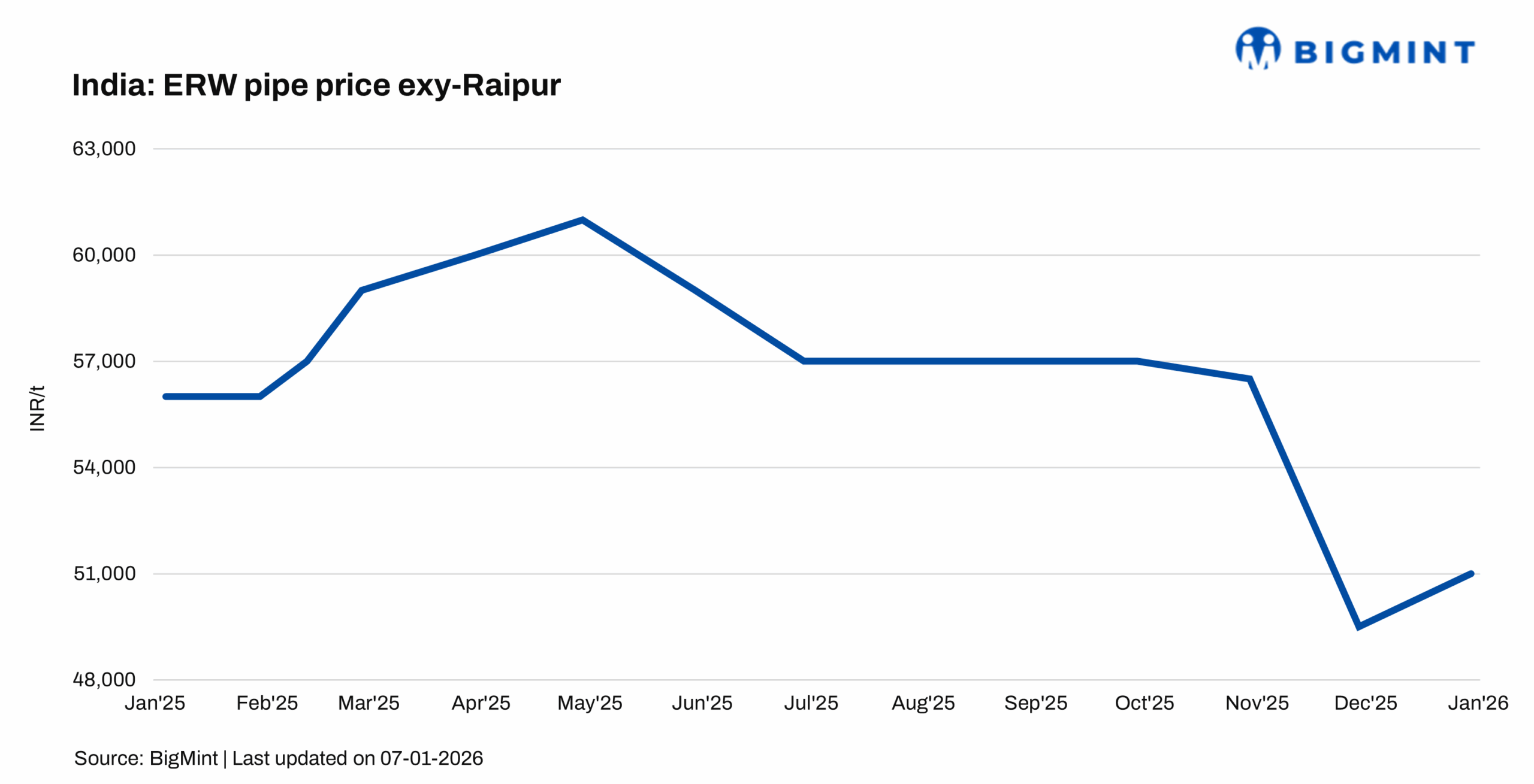 Post-revision, list prices are at INR 51,000/t ($567/t) exy-Raipur, INR 55,000/t ($611/t) exy-Pune, and INR 55,000/t ($611/t) exy-Delhi, excluding 18% GST. These revised prices are effective from 1 January 2026.