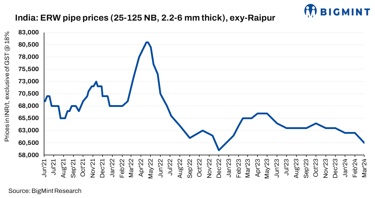 Distributor-level prices for ERW pipe also saw a decline m-o-m amid lack of demand and fall in trade-level HRC prices, which is a key raw material for ERW pipe. ERW pipe prices dropped m-o-m by INR 1500/t ($18/t) to INR 59500/t ($718/t) in March against INR 61000/t ($736/t) in February.