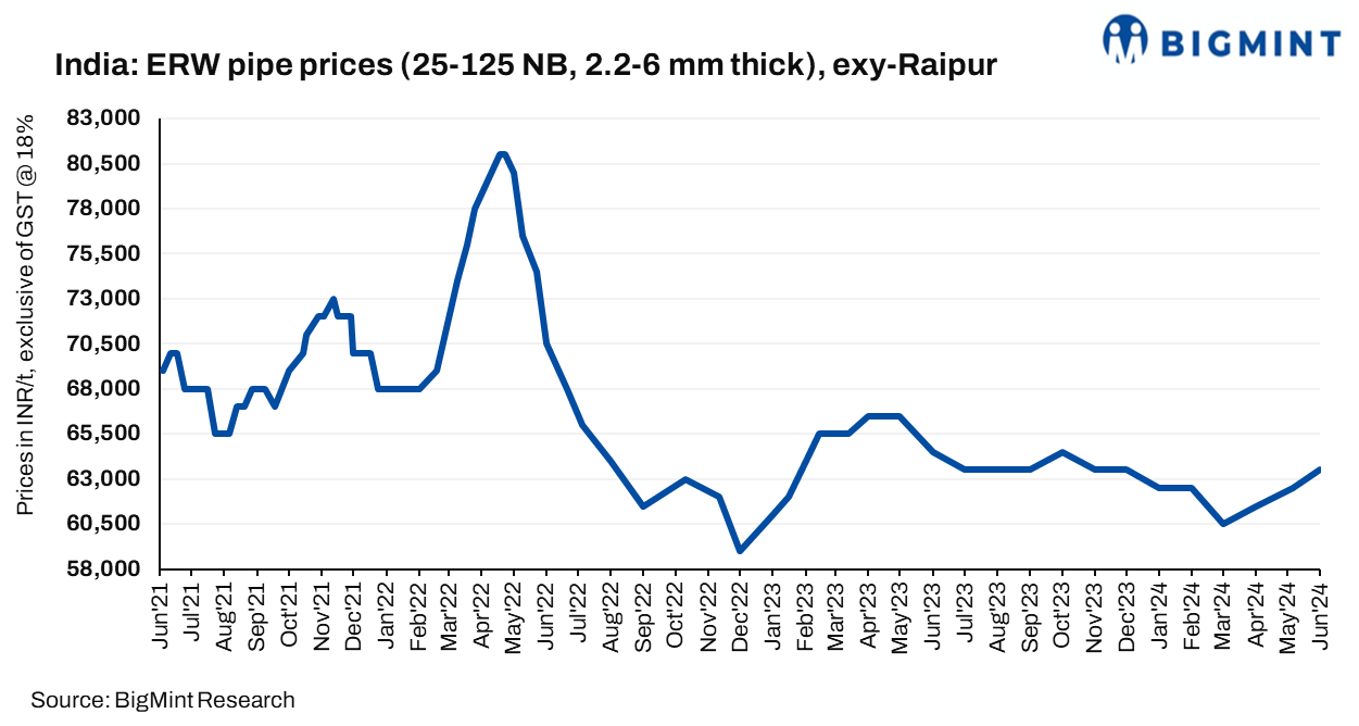 Distributor-level monthly average prices of ERW pipes in Raipur also rose by INR 300/t ($4/t) to INR 60,300/t ($723/t) exy-Raipur in May against INR 60,000/t ($719/t) in April 2024.