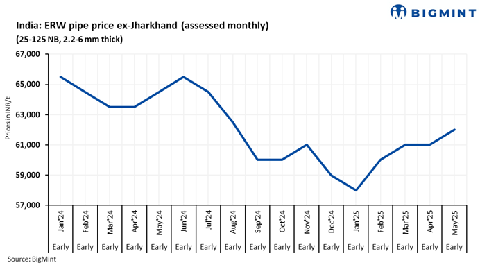 One of India’s leading ERW pipe manufacturer has increased list prices by INR 1,000/t ($12/t) for base-grade pipe (25-125 NB, 2.2-6 mm thickness) for early-May’25 sales. Post-revision, effective prices stand at around INR 62,000/t ($736/t) ex-Jharkhand, excluding GST at 18%